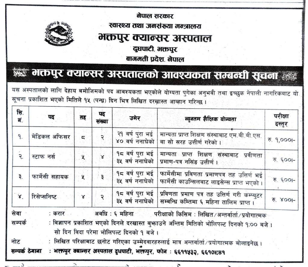 यस अस्पतालको लागि देहाय बमोजिमको पद आवश्यकता भएकोले योग्यता पुगेका अनुभवी तथा इच्छुक नेपाली नागरिकबाट यो सूचना प्रकाशित भएको मितिले १५ (पन्ध्र) दिन भित्र लिखित दरखास्त आव्हान गरिन्छ ।